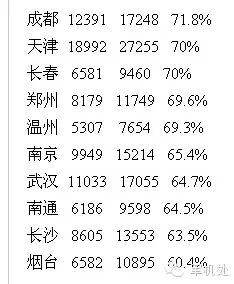 所谓投资率,我这里使用的概念是“全社会固定资产投资总额”除以当年该城市GDP,获得的百分比。为了降低单一年份波动带来的影响,我使用了2012年和2013年固定资产投资总额之和,除以这个城市2012年和2013年的GDP之和,来计算投资率,所有数据来自该城市的统计公报。下面我们看一下数据(表中数据单位均为亿元):